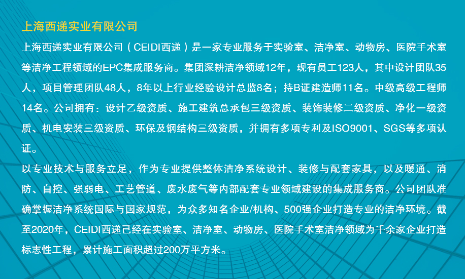 7月23日,由北京實驗動物行業協會、北京實驗動物學學會、江蘇集萃藥康生物科技股份有限公司、北京藥康生物科技有限公司等單位聯合舉辦的“第二屆實驗動物行業發展與合作研討會”在北京拉開帷幕。應組委會邀請,上海西遞實業有限公司(CEIDI西遞)作為江浙滬專業服務于實驗室、潔凈室、動物房、醫院手術室等潔凈工程的EPC集成服務商,本次派出了資深設計與商務組成的技術團隊抵京參與交流。>>>商務洽談,點此處,在線咨詢